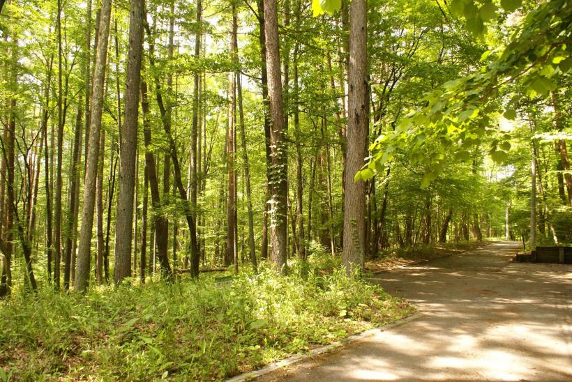 温泉やバス停のあるフロント棟から約650m。メインストリートから一歩入った、閑静な森の空間を望む土地。道の先には2件の家が建つのみの行き止まり…